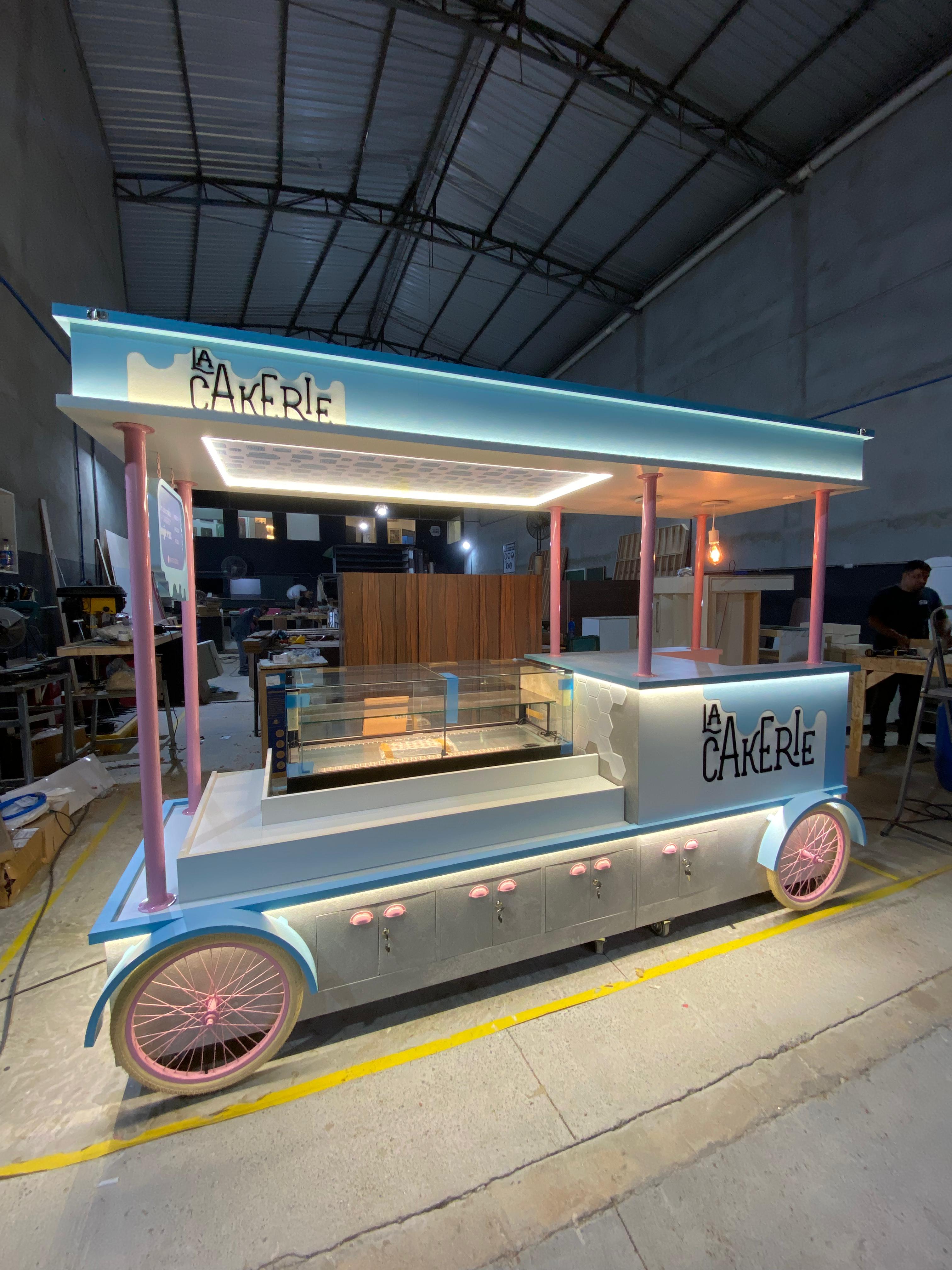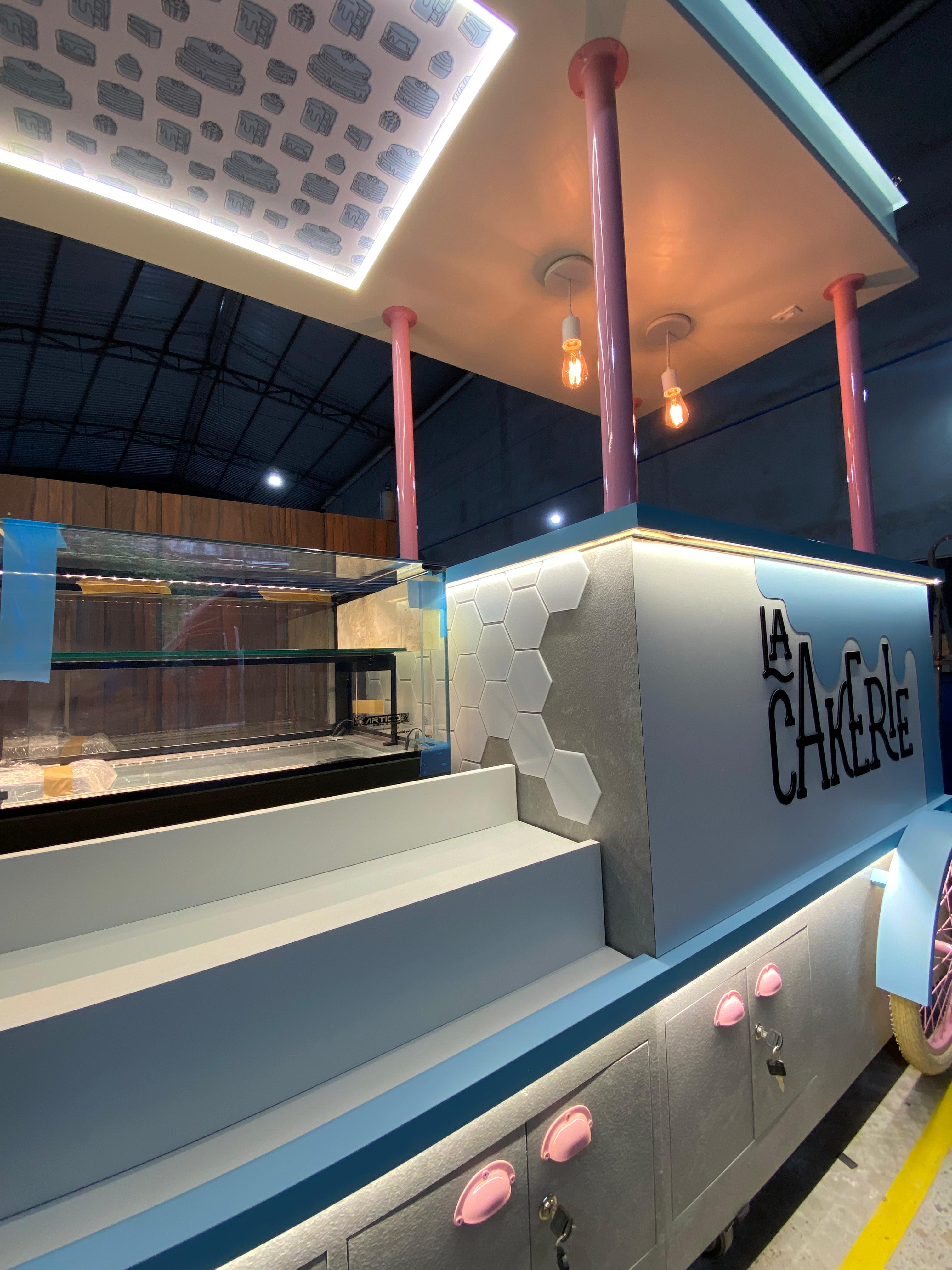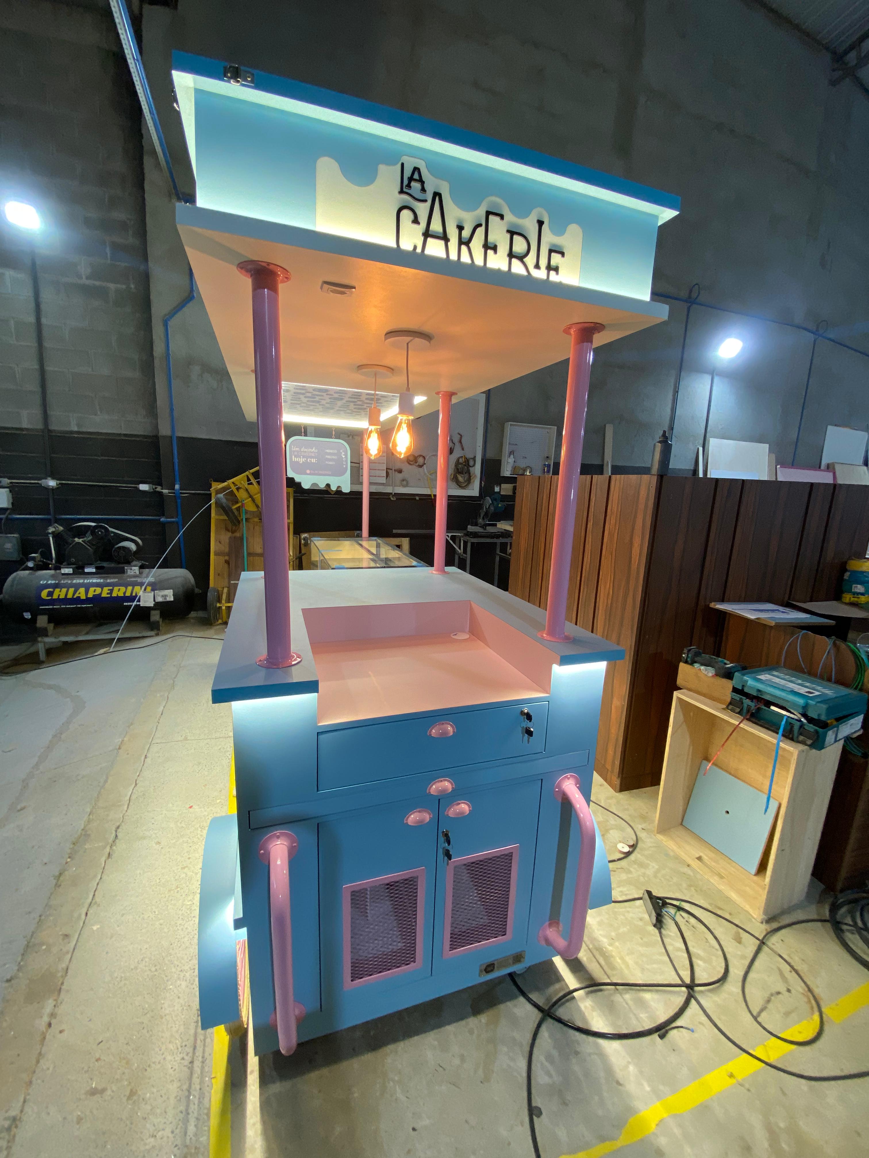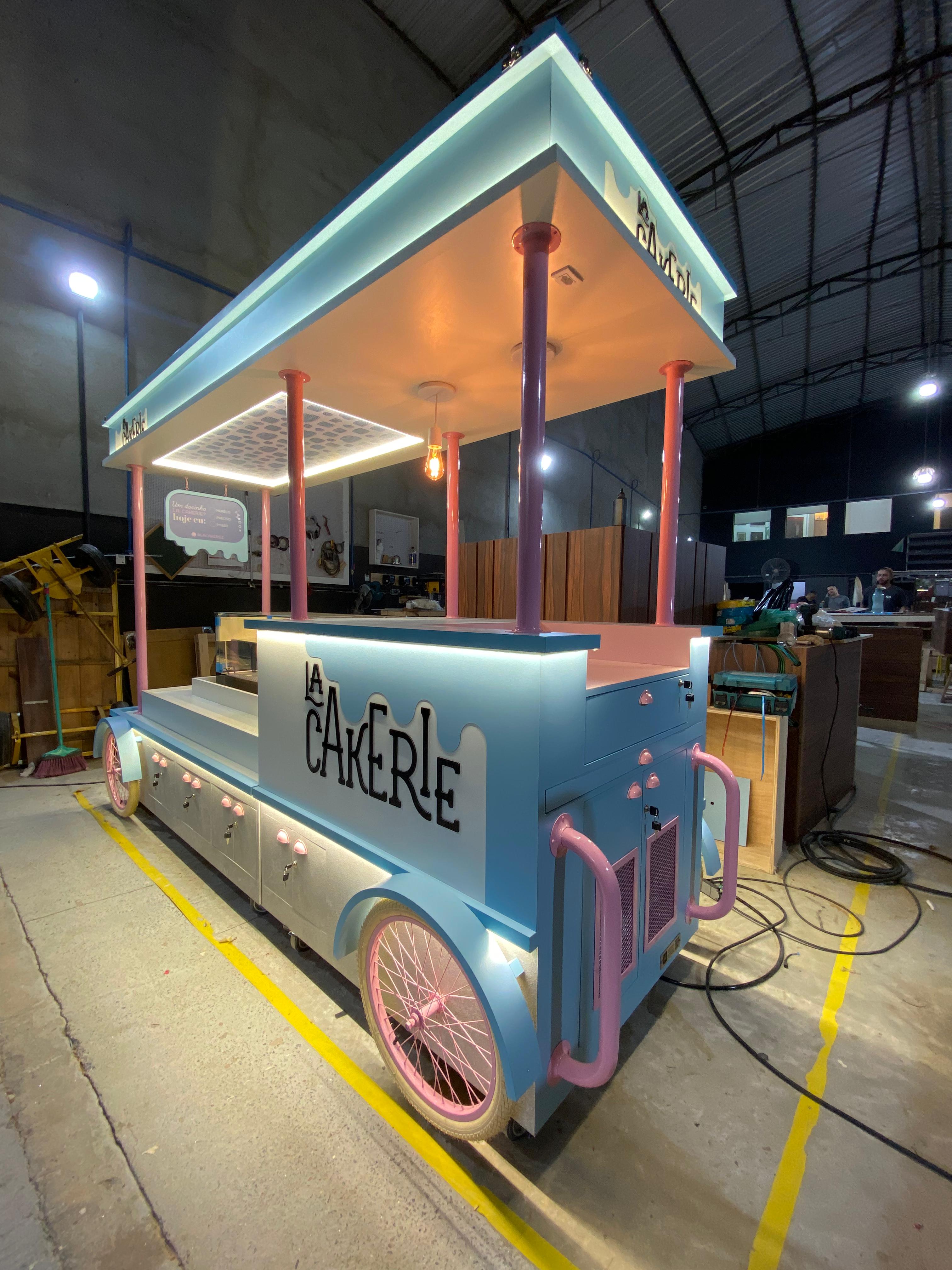 Os acabamentos do carrinho La Cakerie foram inspirados no conceito visual existente da loja da própria marca.